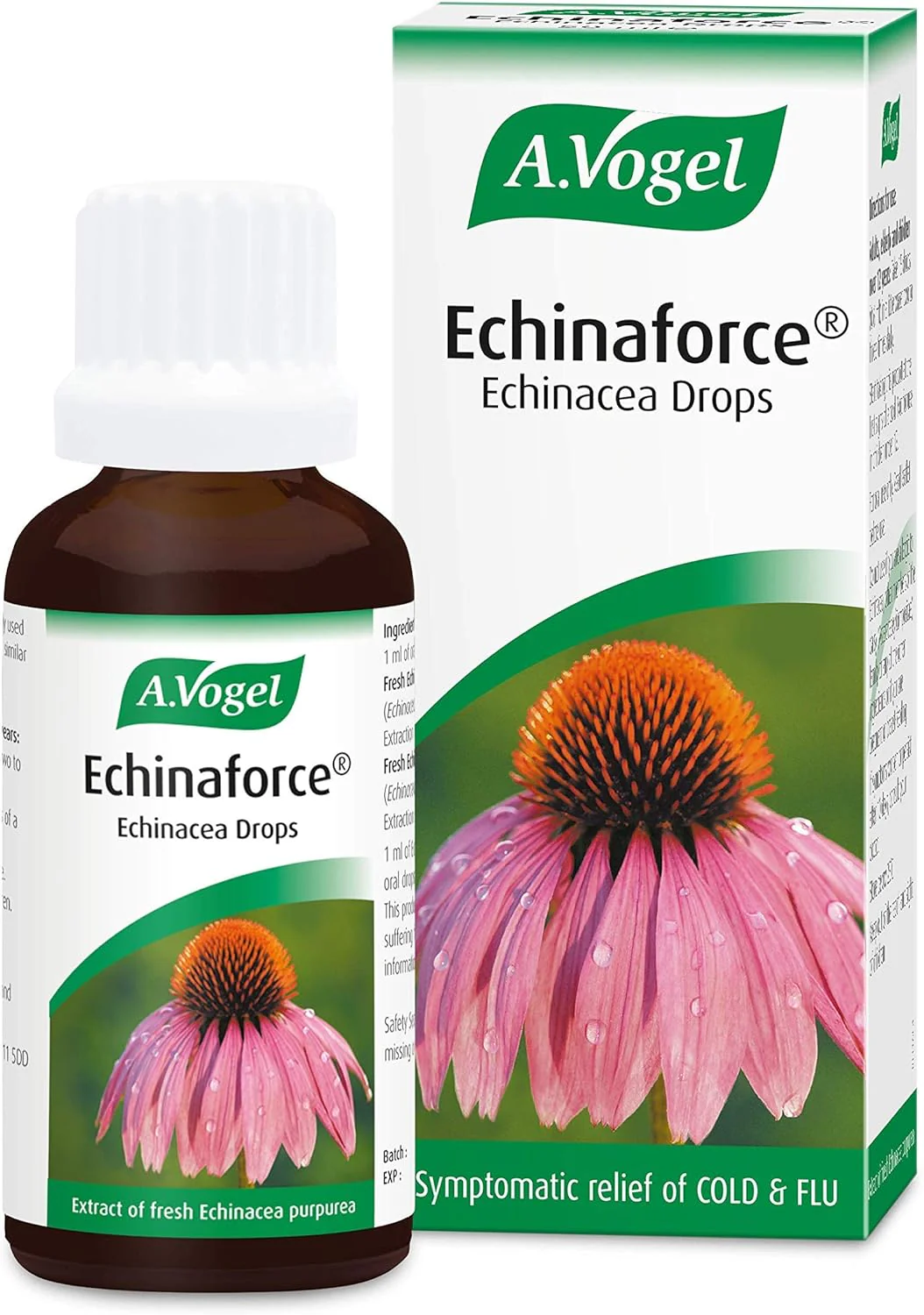 This is the original extract formulated by Alfred Vogel and contains the tinctures of Echinacea purpurea herb and root. 0.6ml drops equivalent to 285mg whole fresh plant. Also contains 65%v/v ethanol.