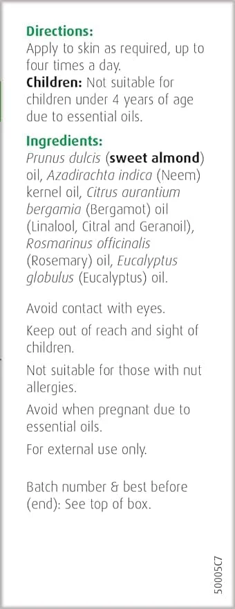 Contains a unique blend of Prunus dulcis (Sweet almond) oil, Azadirachta indica (Neem) kernal oil, Citrus aurantium bergamia (Bergamot) oil, Rosmarinus officinalis (Rosemary) oil and Eucalyptus globulus (Eucalyptus) oil for the benefit of your skin.