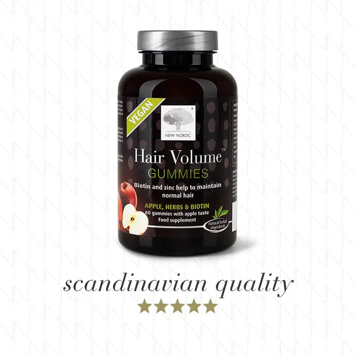 New Nordic Hair Volume Gummies (60) are formulated with apple, millet, horsetail, biotin, and zinc to provide essential nutrients to the scalp and hair follicles. The combination of biotin and zinc helps promote healthy hair and skin, while also supporting normal nail health.