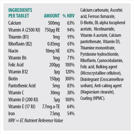 Calcium carbonate, Bulking agent (Microcrystalline cellulose), dl alpha tocopherol acetate, Ascorbic acid, Coating (Hydroxy propyl methylcellulose, Colour: Titanium dioxide), Sodium carboxy methylcellulose, Ferrous fumarate, Anti-caking agents (Vegetable magnesium stearate, Silicon dioxide), Nicotinamide, Vitamin A acetate, Calcium pantothenate, Cholecalciferol, Thiamin mononitrate, Pyridoxine hydrochloride, Riboavin, Cyanocobalamin, Folic acid, D-biotin.